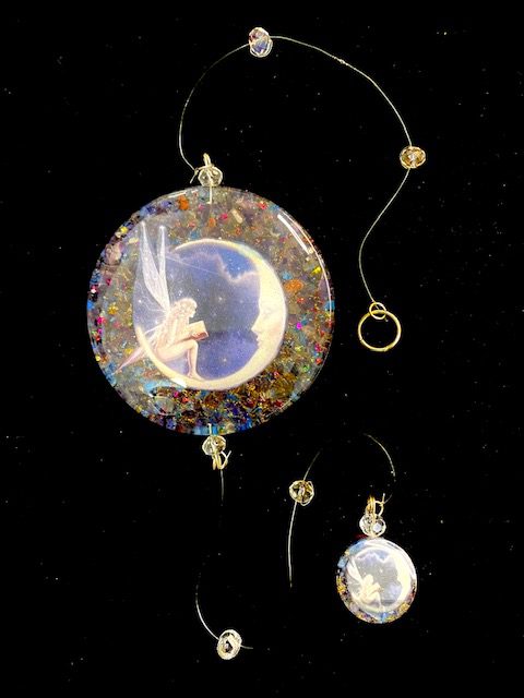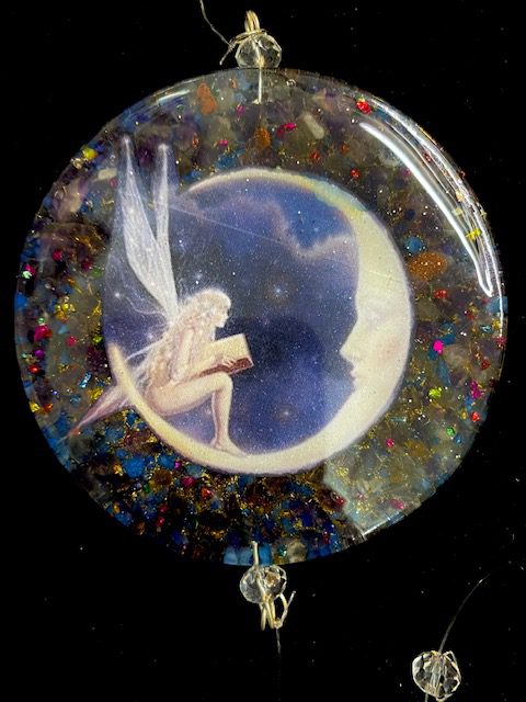 Colgante de Pared con con diseño de Hada de la Noche. Hecho de Resina, Metal y Cuarzo Interior. Medida 7,5cm diámetro y 58cm de largo aprox