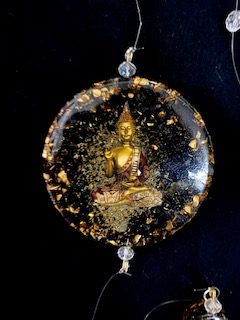 Colgante de Pared de orgon con diseño de Buda. Hecho de Resina, Metal y Cuarzo Interior. Medida 7,5cm diámetro y 58cm de largo aprox
