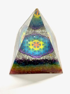 Pirámide Grande de orgon con símbolo Flor de la vida y cuarzos 7 chakras, hecha de Resina, Metal y Cuarzo Medidas: Alto 6cm y 6cm de base