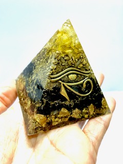 Pirámide Grande de orgón con símbolo Ojo de Horus. Hecha de Resina, Metal y Cuarzo Interior. Alcance de protección y limpieza 6 mts a la redonda. Medidas: Alto 6cm y 6cm de base.