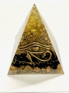 Pirámide Grande de orgón con símbolo Ojo de Horus. Hecha de Resina, Metal y Cuarzo Interior. Alcance de protección y limpieza 6 mts a la redonda. Medidas: Alto 7,5cm y 8cm de base aprox.