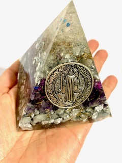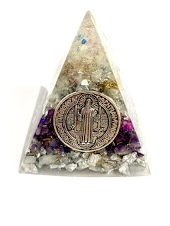 Pirámide Grande de Orgon con San Benito 7cm de base. Hecha de Resina, Metal y Cuarzo Interior de 8 m2 aproximados de radio de protección (Seis mts a la redonda). Medidas: Alto 7cm y 7cm de base.