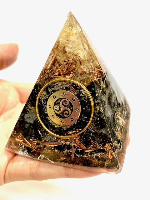 Pirámide Grande de orgón con símbolo Trisquel. Hecha de Resina, Metal y Cuarzo Interior